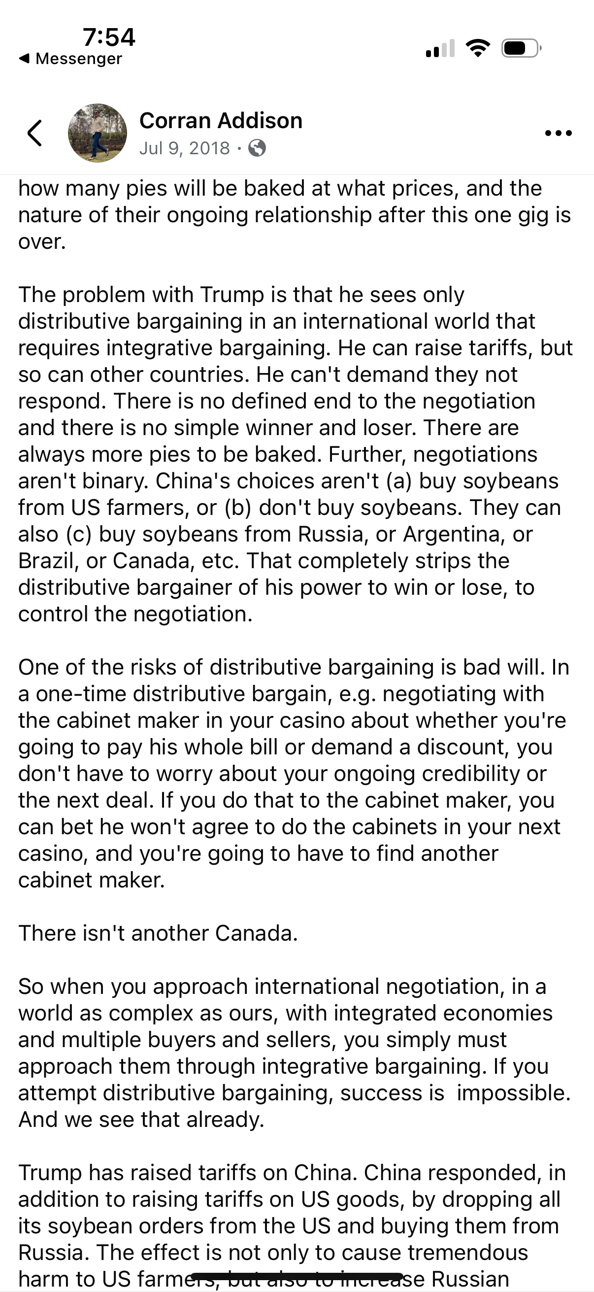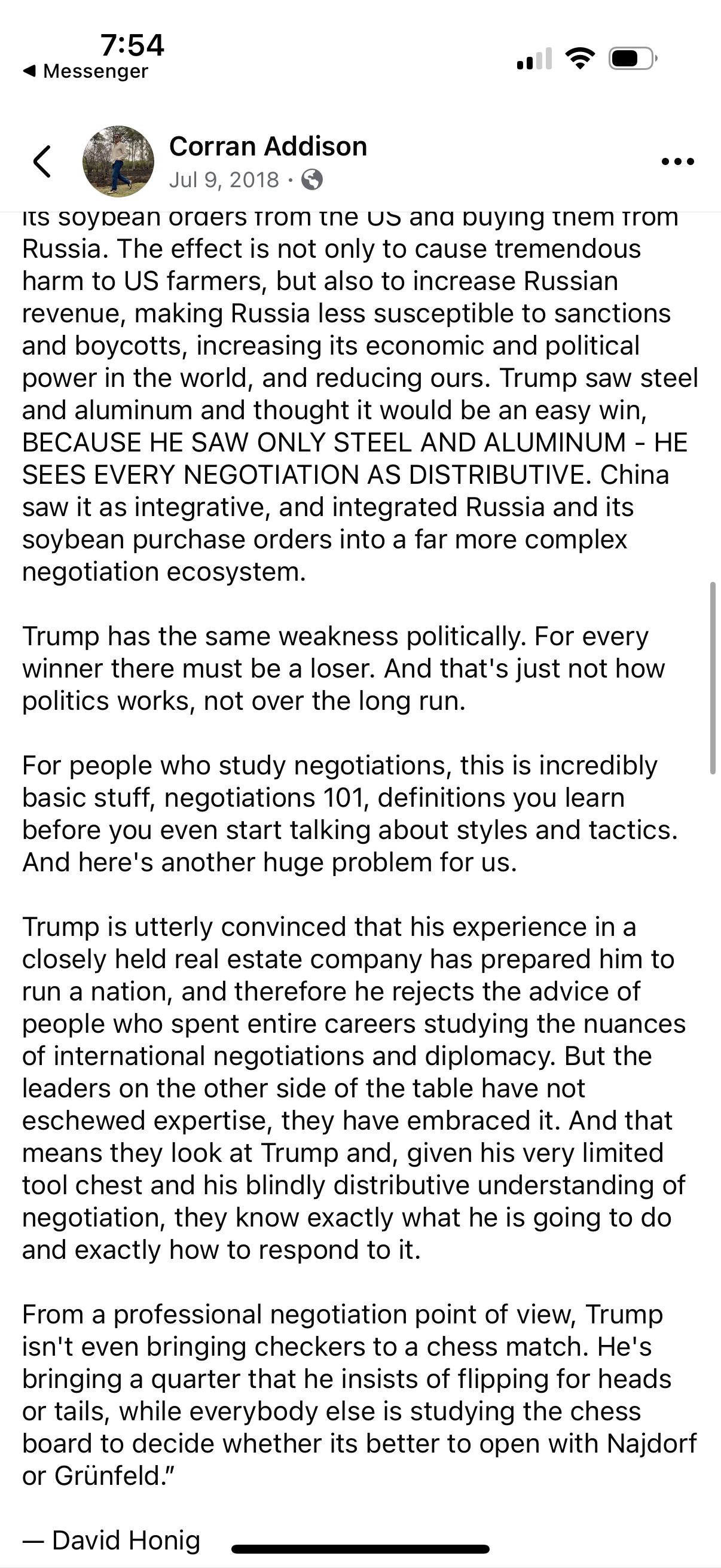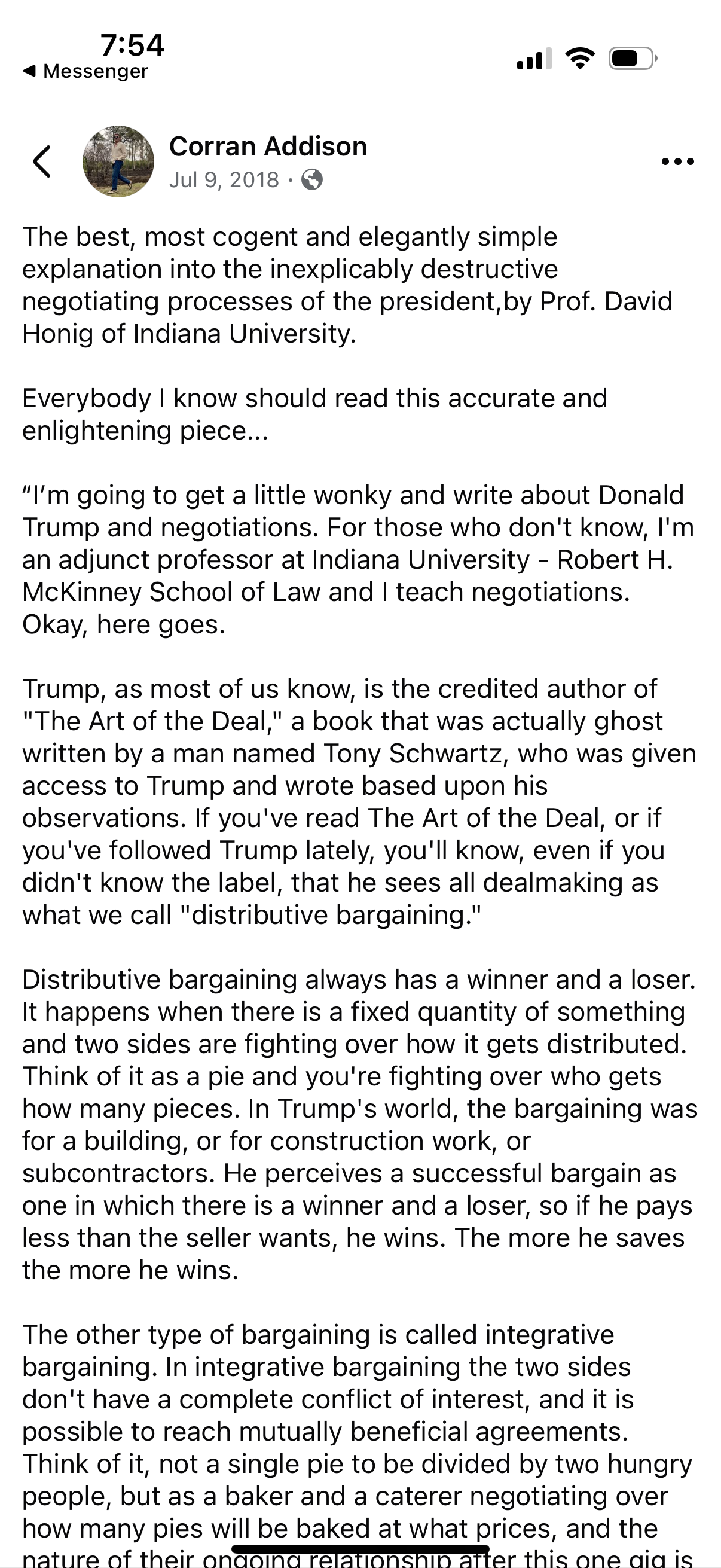 Indiana University – Robert H. McKinney School of Law’s adjunct professor 兼职教授 David Honig wrote about Donald Trump’s art of deal making in 2018. He stresses on