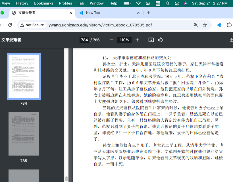 当她的丈夫范权从医院被叫回家来的时候, 他被告知妻子已经上吊自杀.他看到妻子的身体吊在门框上,一只手垂着,显然是死亡以前已经被打断了骨头.只有一只好胳膊的人肯定没有能力把自己吊死. 另外,范权只看到了妻子的背影. 他走近被吊的妻子尸体想要看妻子的脸,却被红卫兵一下子打昏在地.等他醒来,妻子的尸体已经被运走了.