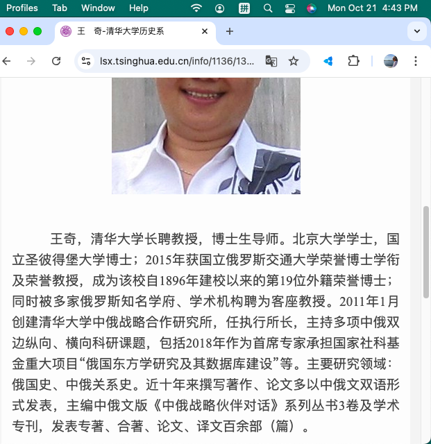 王奇,清华大学长聘教授,博士生导师。北京大学学士,国立圣彼得堡大学博士;2015年获国立俄罗斯交通大学荣誉博士学衔及荣誉教授,成为该校自1896年建校以来的第19位外籍荣誉博士;同时被多家俄罗斯知名学府、学术机构聘为客座教授。2011年1月创建清华大学中俄战略合作研究所,任执行所长,主持多项中俄双边纵向、横向科研课题,包括2018年作为首席专家承担国家社科基金重大项目“俄国东方学研究及其数据库建设”等。主要研究领域:俄国史、中俄关系史。近十年来撰写著作、论文多以中俄文双语形式发表,主编中俄文版《中俄战略伙伴对话》系列丛书3卷及学术专刊,发表专著、合著、论文、译文百余部(篇)。