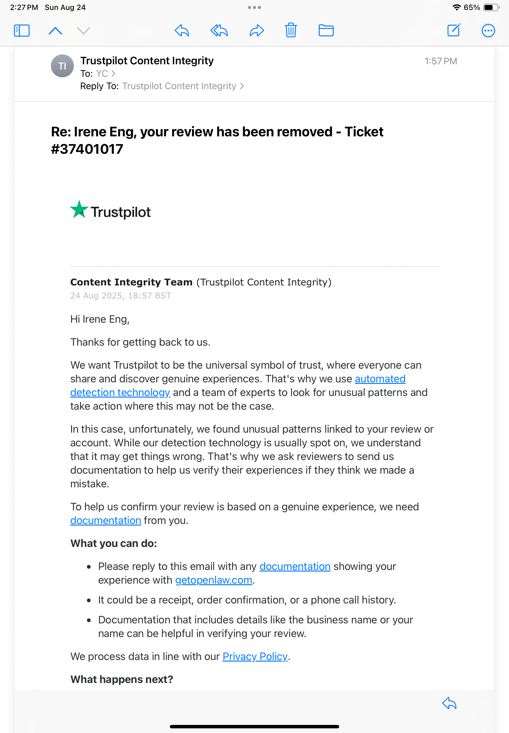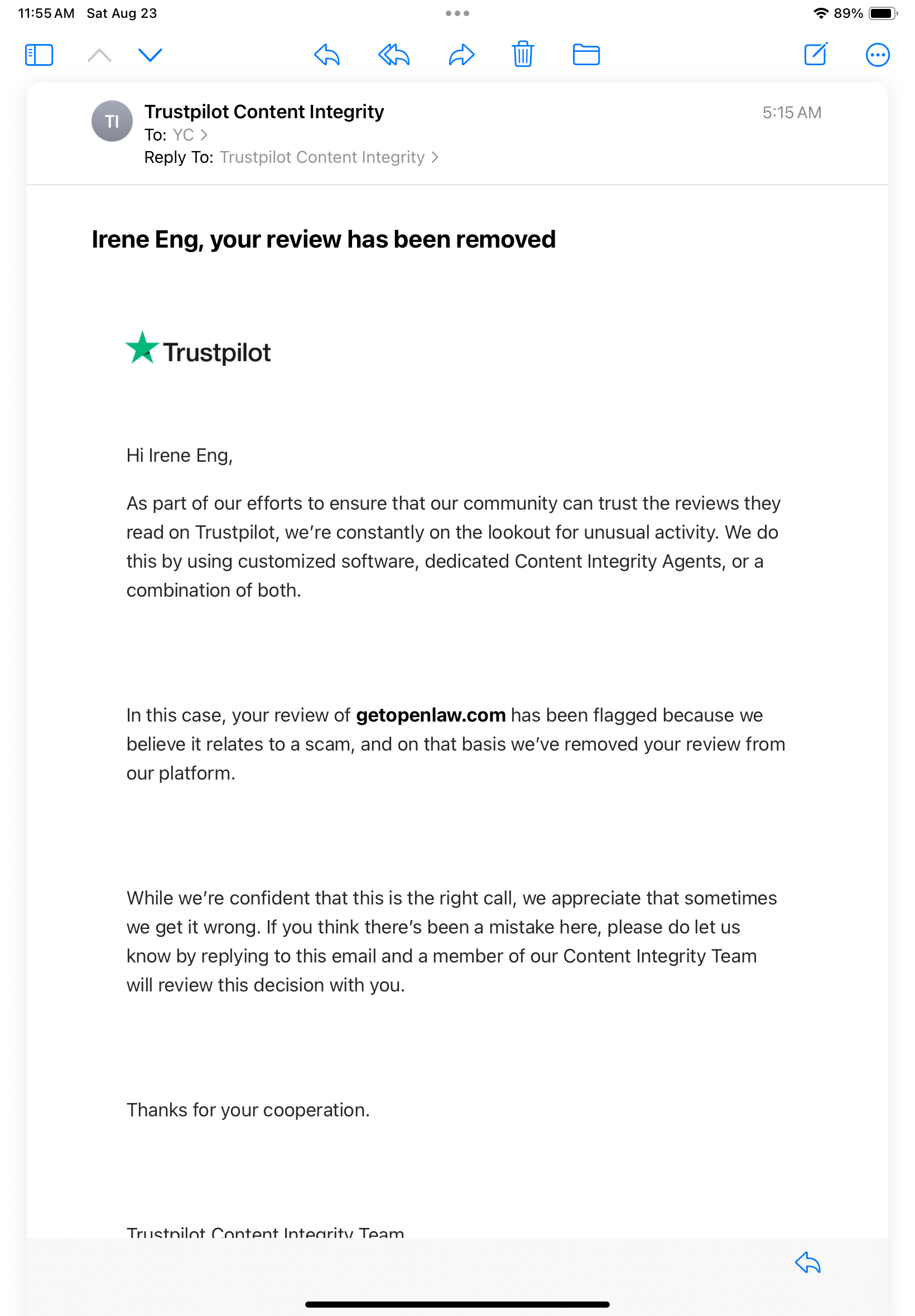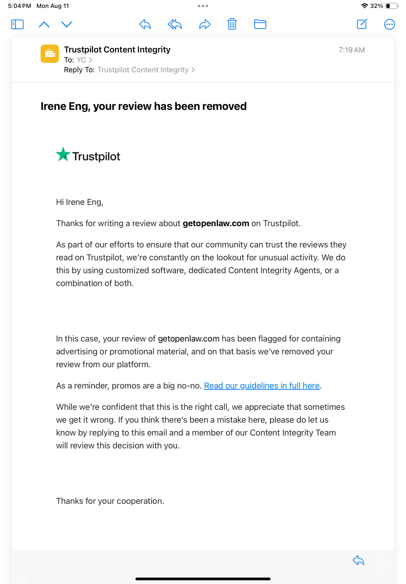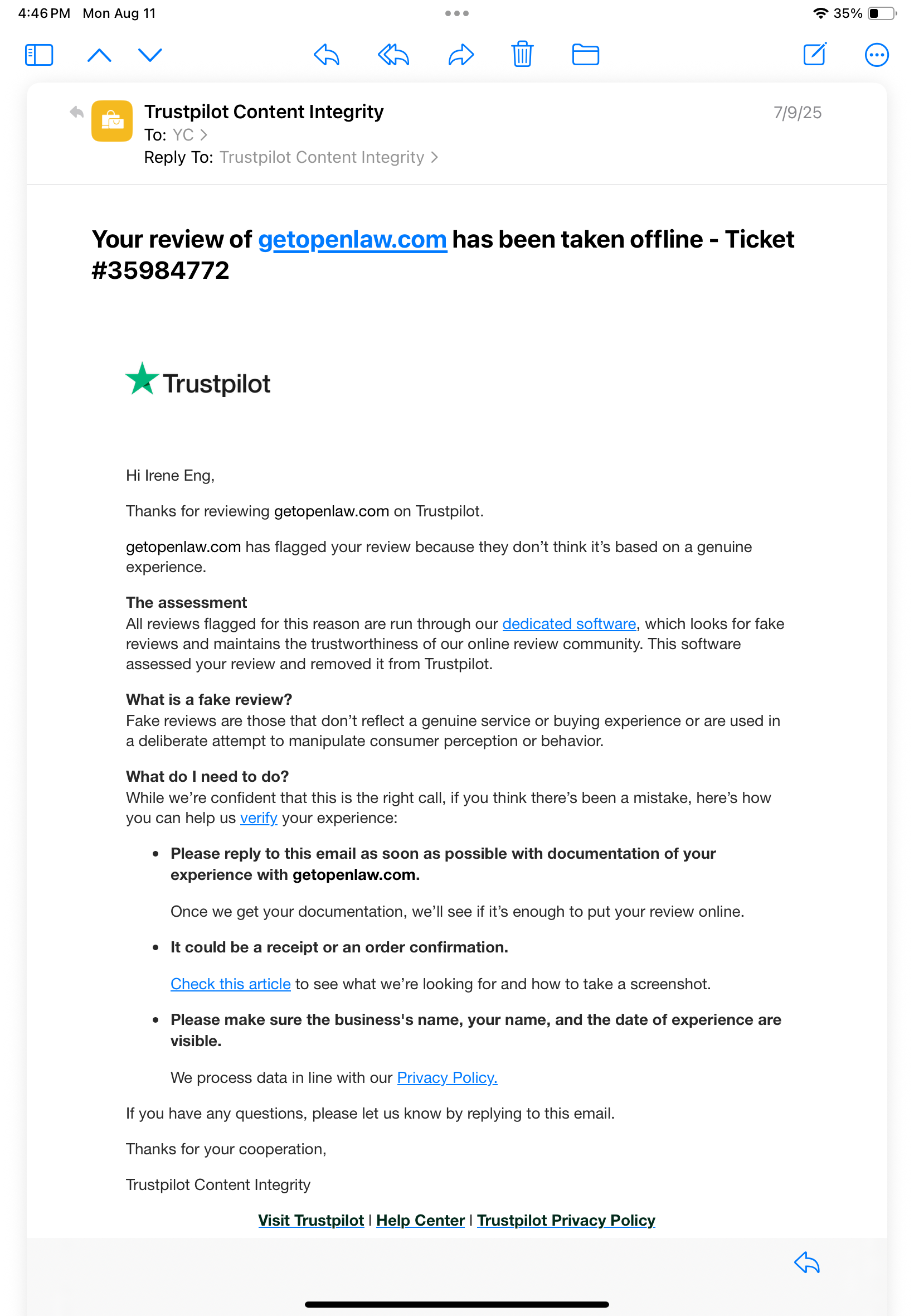 The 2nd time, TrustPilot wrote, “getopenlaw.com has flagged your review because they don’t think it’s based on a genuine experience.”