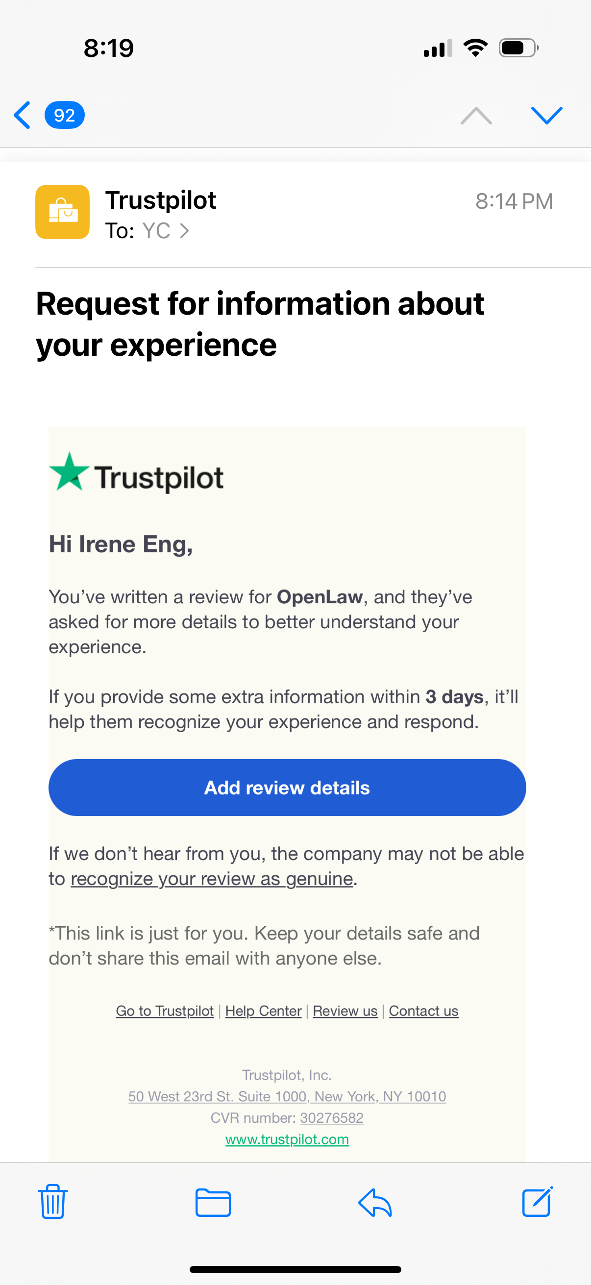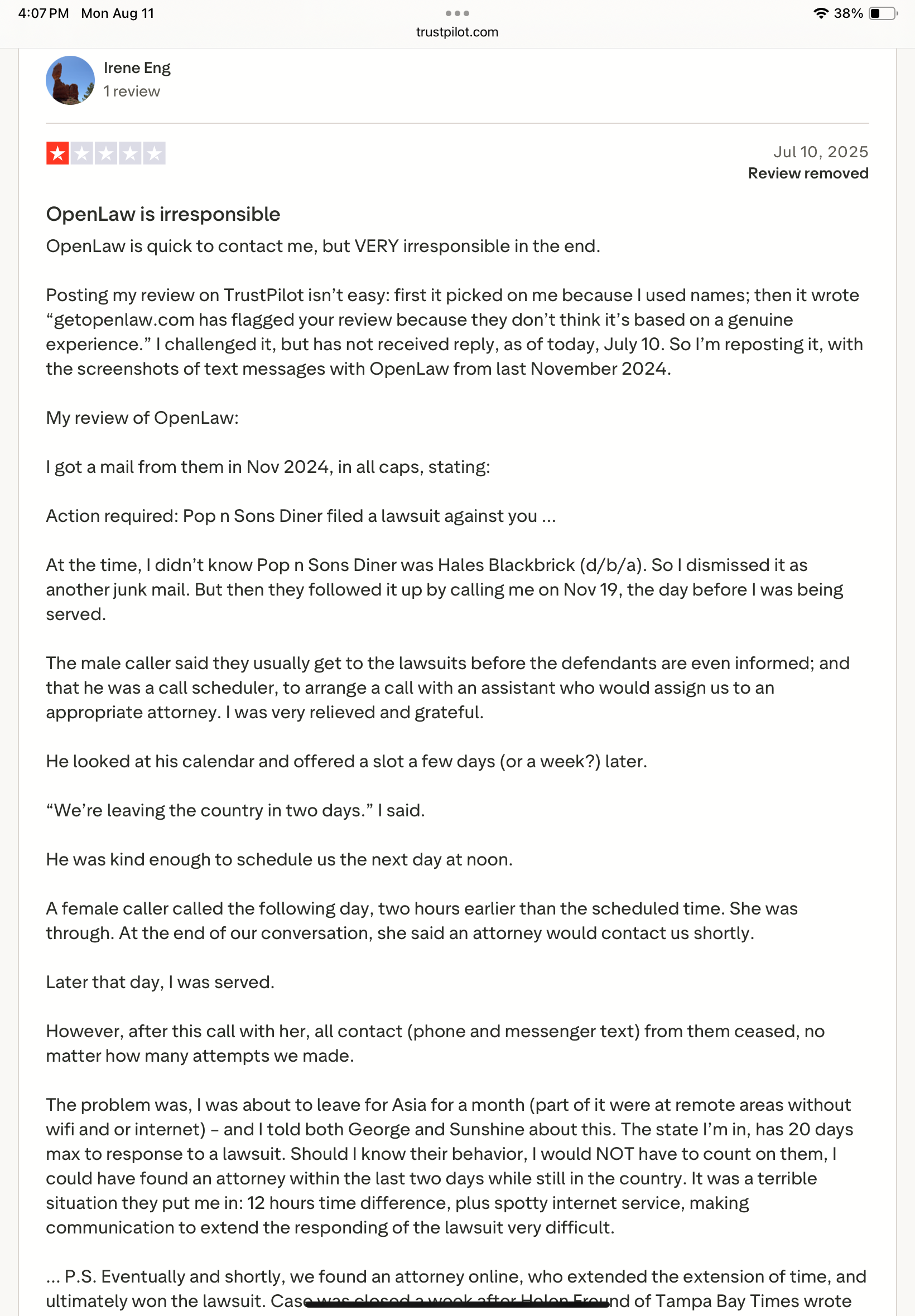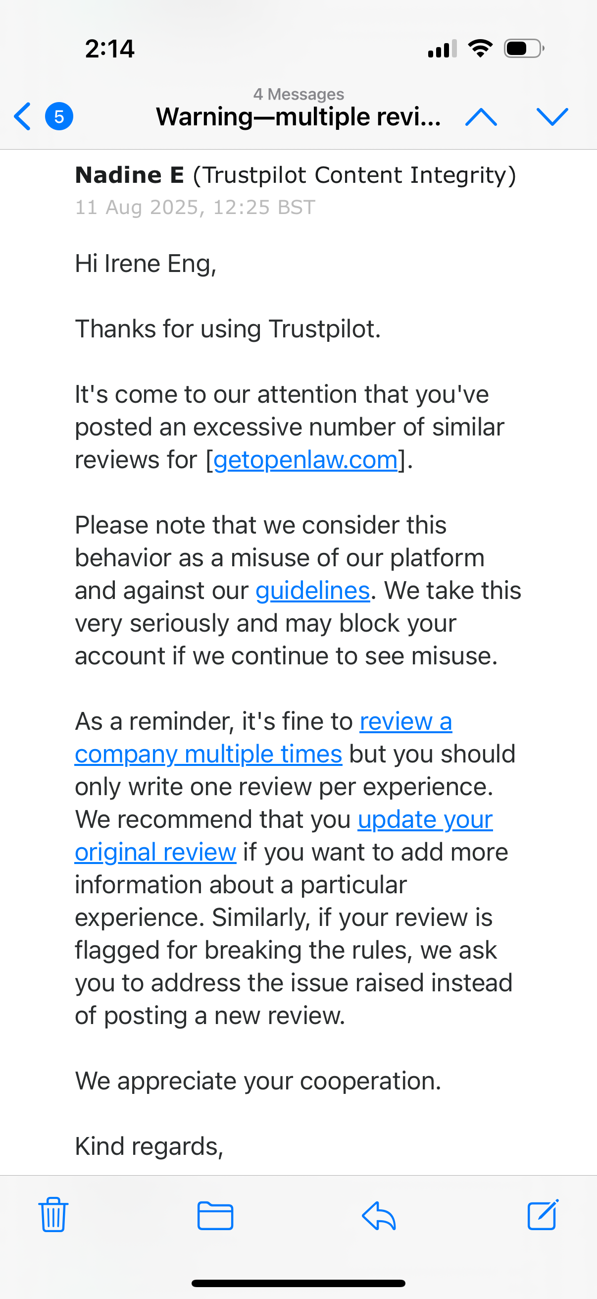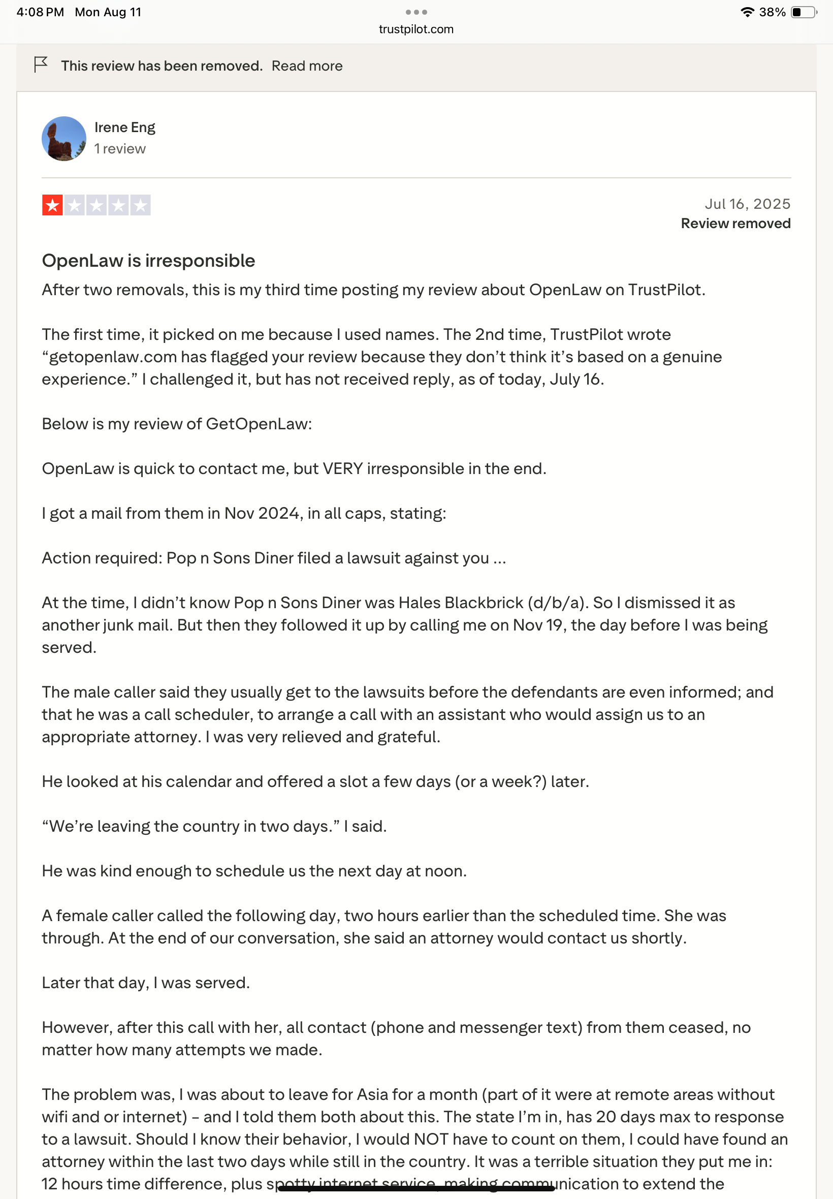 The 2nd time, TrustPilot wrote, “getopenlaw.com has flagged your review because they don’t think it’s based on a genuine experience.”