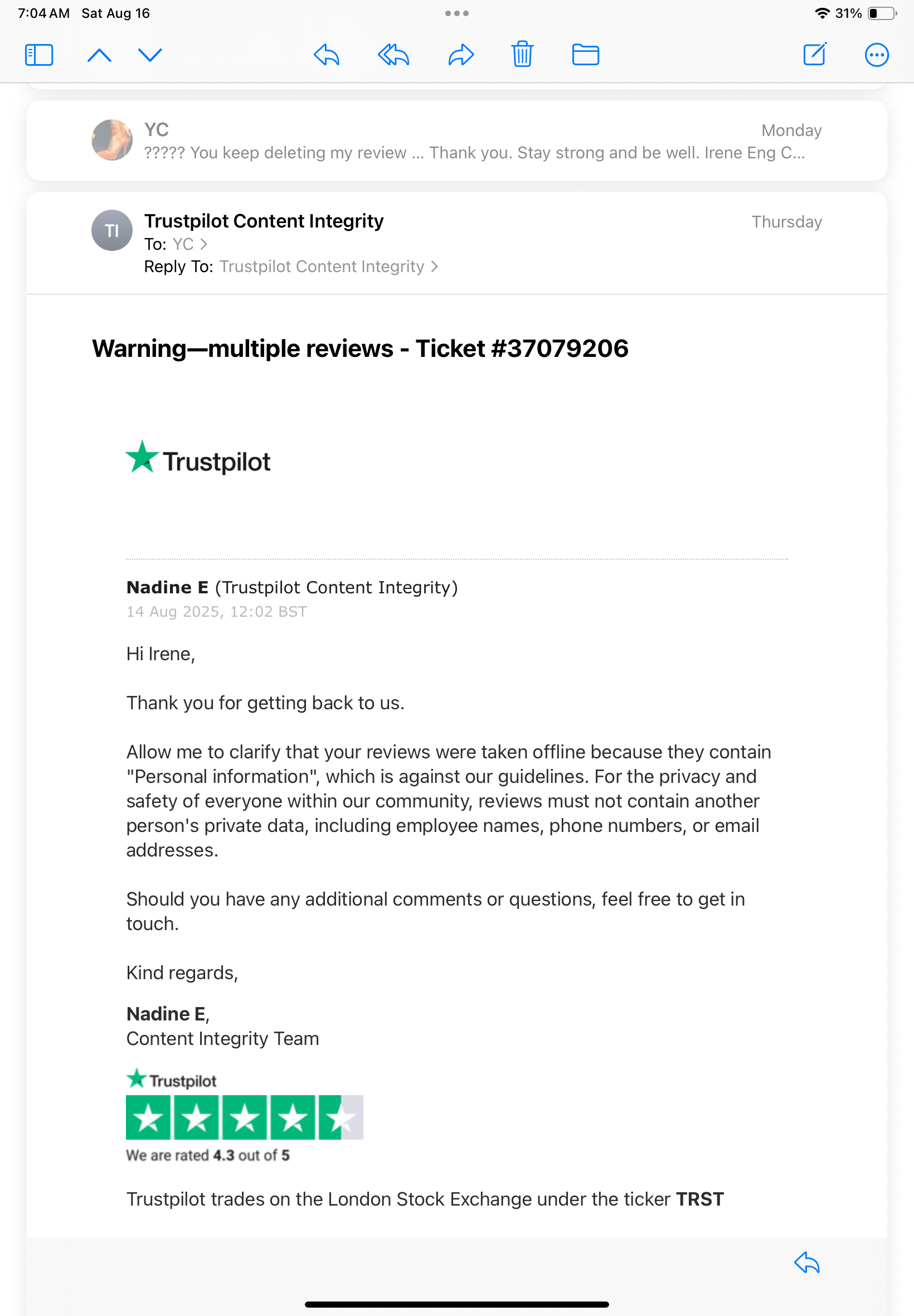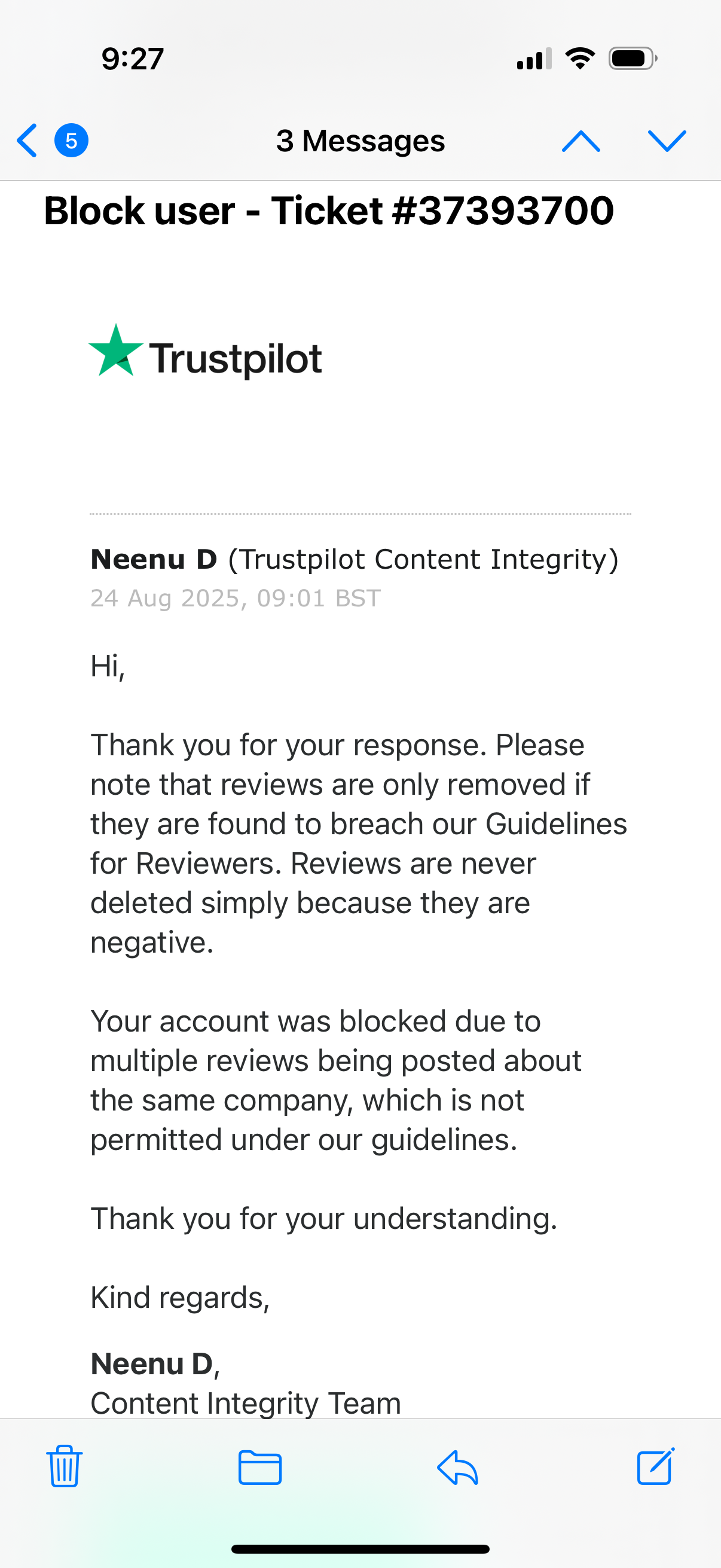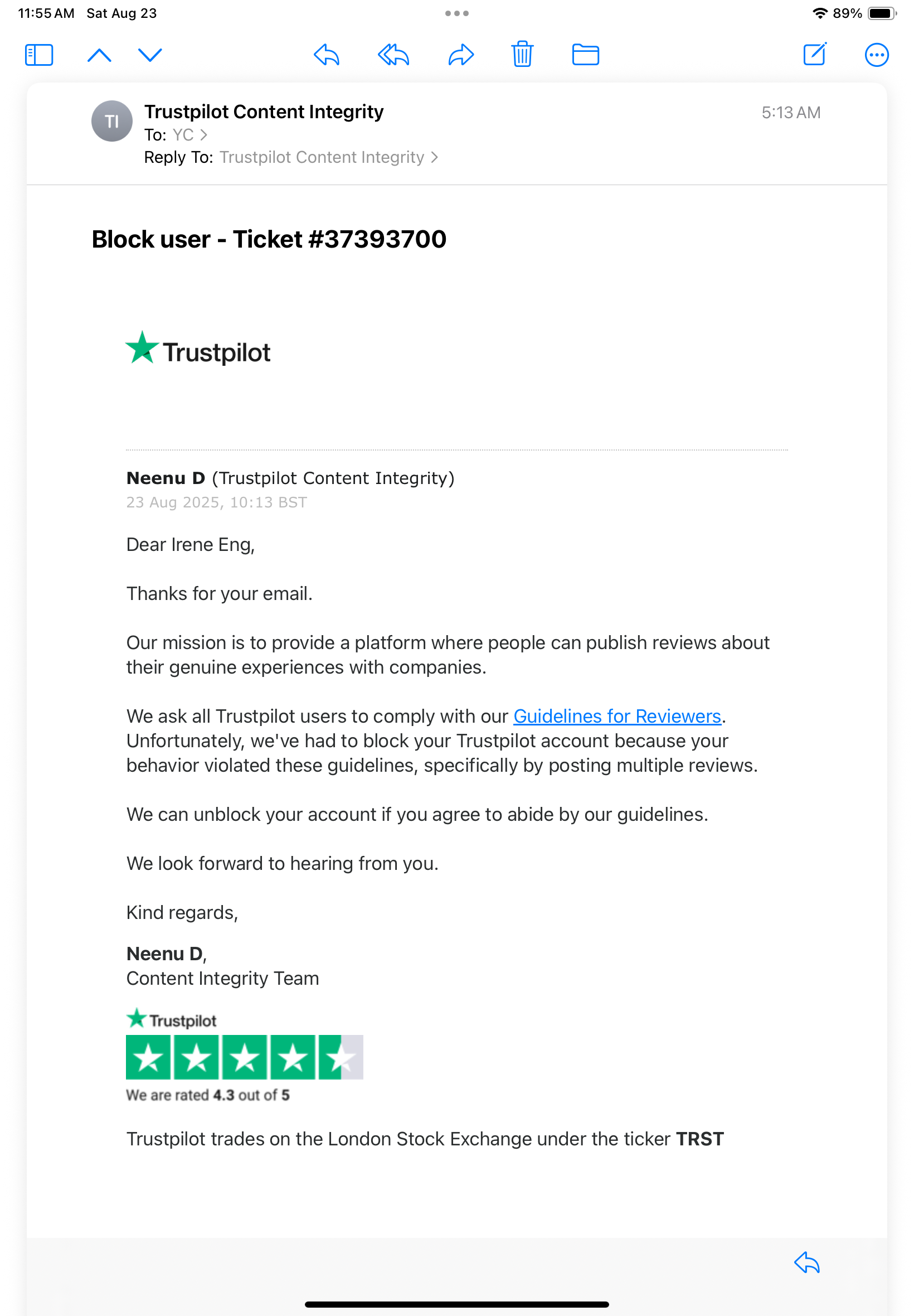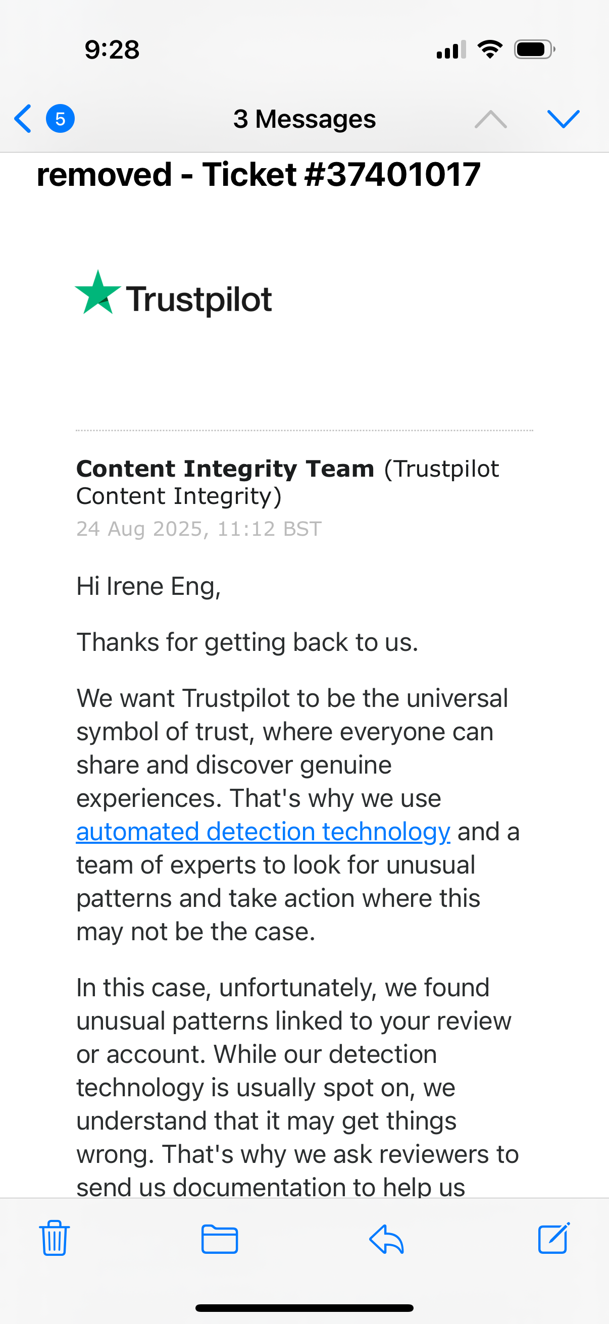 The 2nd time, TrustPilot wrote, “getopenlaw.com has flagged your review because they don’t think it’s based on a genuine experience.”