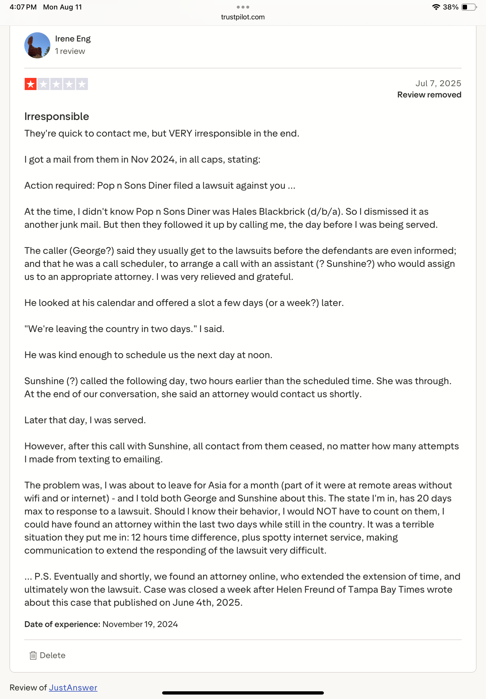 P.S. Eventually, we found an attorney online, who made the extension, and ultimately won the lawsuit. The case was closed a week after Helen Freund’s front page story on Tampa Bay Times, published on June 8, 2025:She reviewed a Tampa restaurant on Yelp. Then came a lawsuit.’
