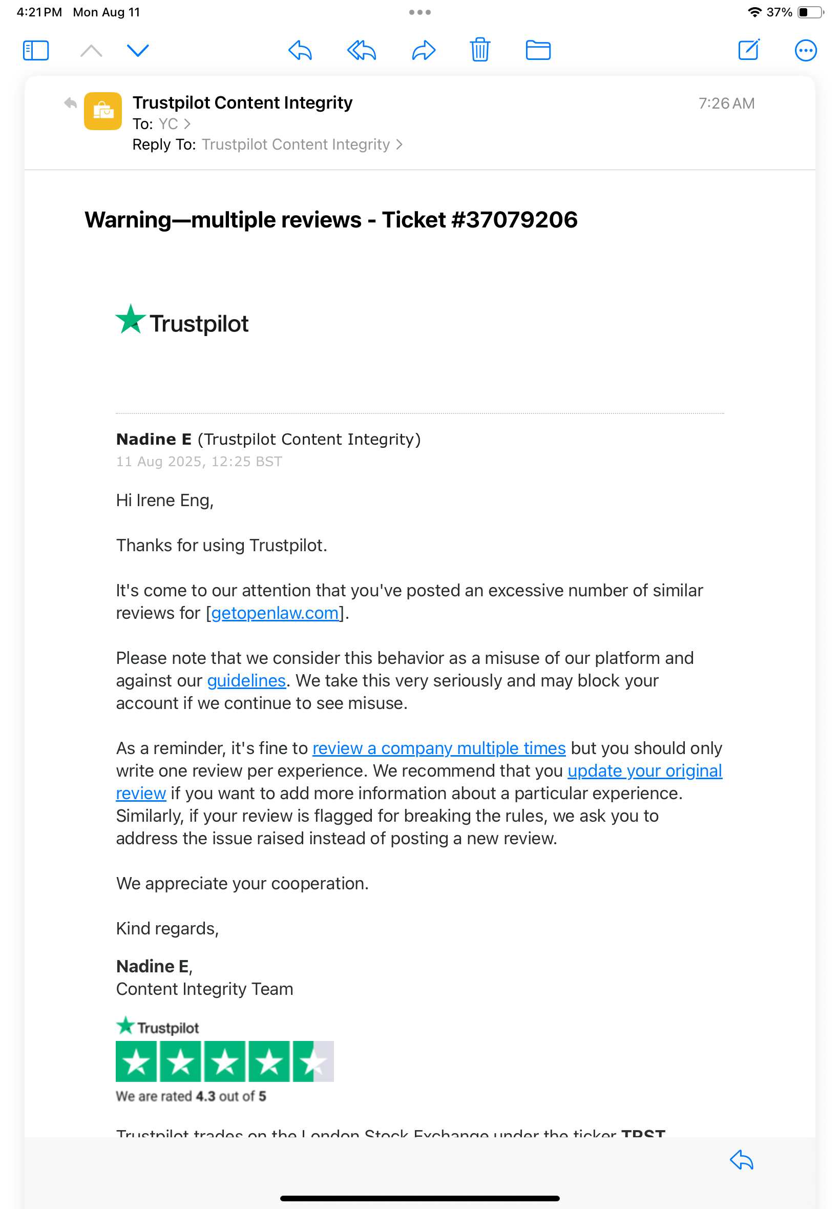Below is my 4th review of GetOpenLaw, on TrustPilot, posted on Aug 11, 2025 (4.7 out of 5 from 26 reviews):