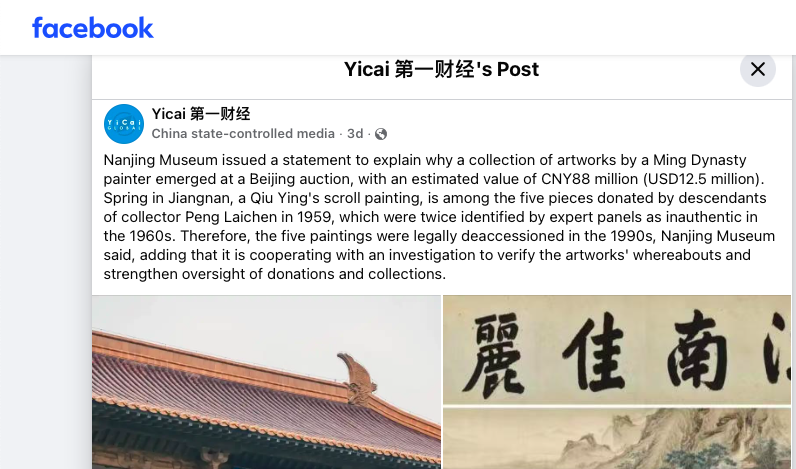 Yicai 第一财经’s Post: Nanjing Museum issued a statement to explain why a collection of artworks by a Ming Dynasty painter emerged at a Beijing auction, with an estimated value of CNY88 million (USD12.5 million). Spring in Jiangnan, a Qiu Ying’s scroll painting, is among the five pieces donated by descendants of collector Peng Laichen in 1959, which were twice identified by expert panels as inauthentic in the 1960s. Therefore, the five paintings were legally deaccessioned in the 1990s, Nanjing Museum said, adding that it is cooperating with an investigation to verify the artworks’ whereabouts and strengthen oversight of donations and collections.