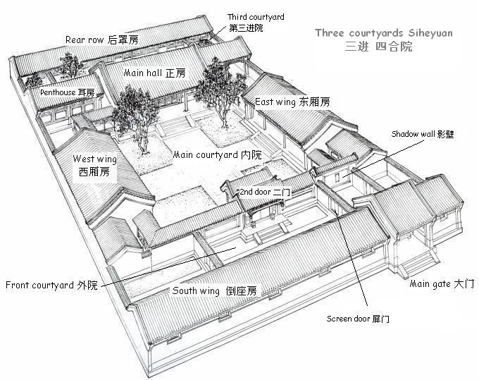 The house is always on the north-south grid to maximize the sun exposure. The main gate is on the southern side, toward east end. The size/type of a siheyuan is determined by its courtyards. This blueprint is 3-courtyard siheyuan: one large with two small on either end. My home has two which was the standard.