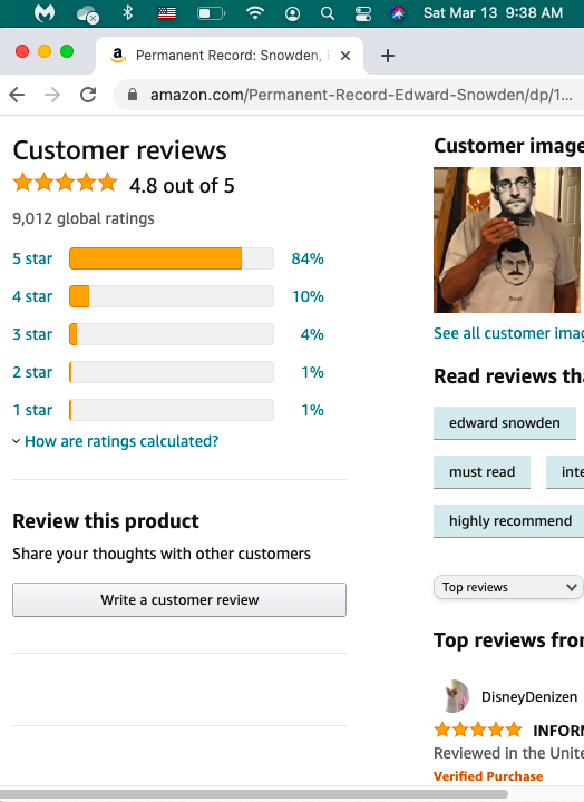 A memoir by Edward Snowden, publisher by Metropolitan Books (Macmillan; FB page…) of USA. At this writing, it has 9,012 ratings on Amazon, of which 84% are five star. (Obama’s A Promised Land has 93% 5 star.)