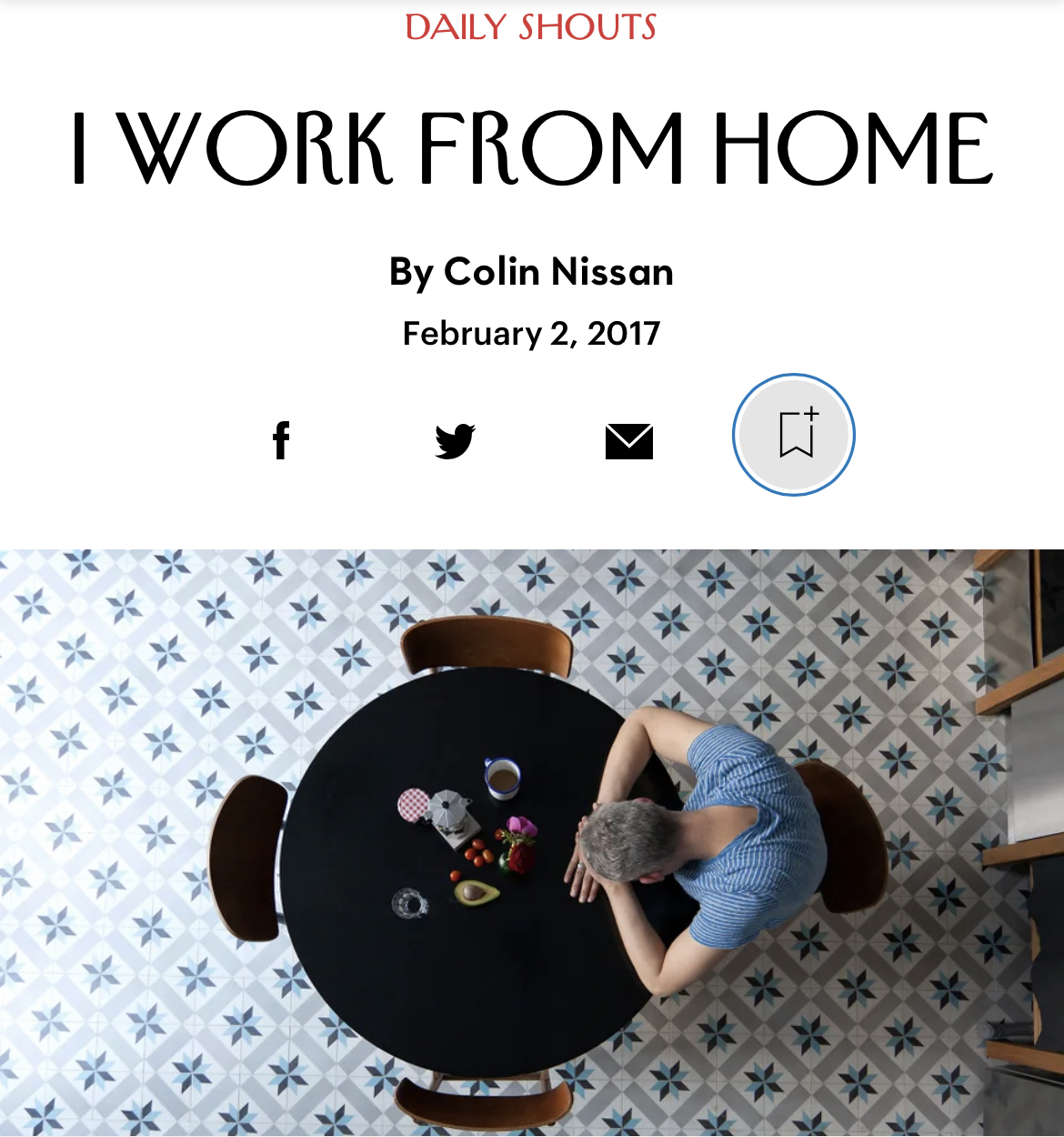 I work from Home was a humorous piece by Colin Nissan, published on New Yorker‘s Daily Shouts in 2017, when work from home had just began to take a form and shape. It seems so fitting that five years on, and a pandemic is still raging, that work from home becoming increasingly popular. The lockdown in Shanghai, seen many people live in their offices.