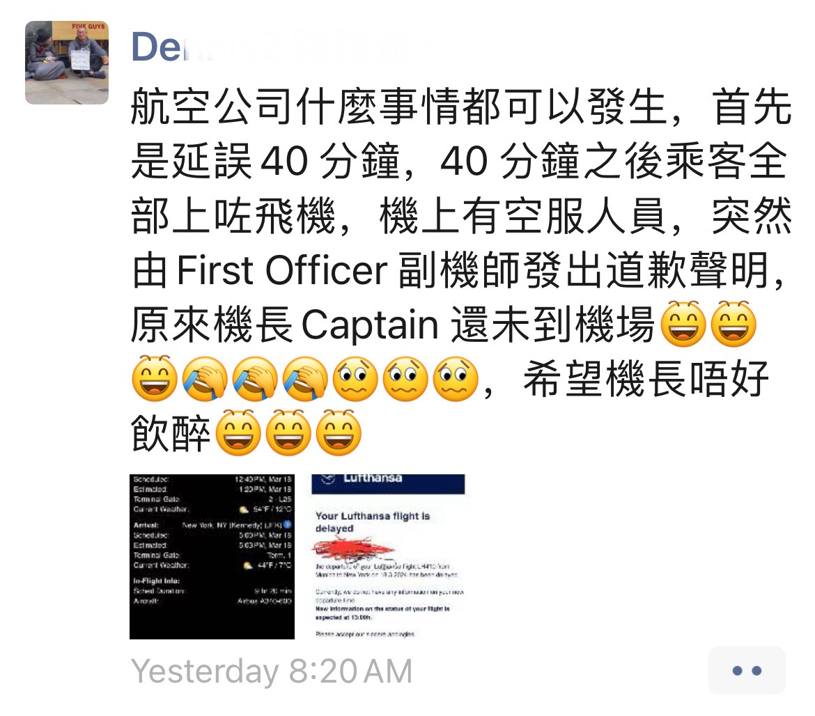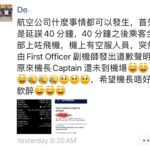 航空公司什麼事情都可以發生,首先是延誤40 分鐘,40 分鐘之後乘客全部上咗飛機,機上有空服人員,突然由First Officer 副機師發出道歉聲明,原來機長Captain 還未到機場, 希望機長唔好飲醉.