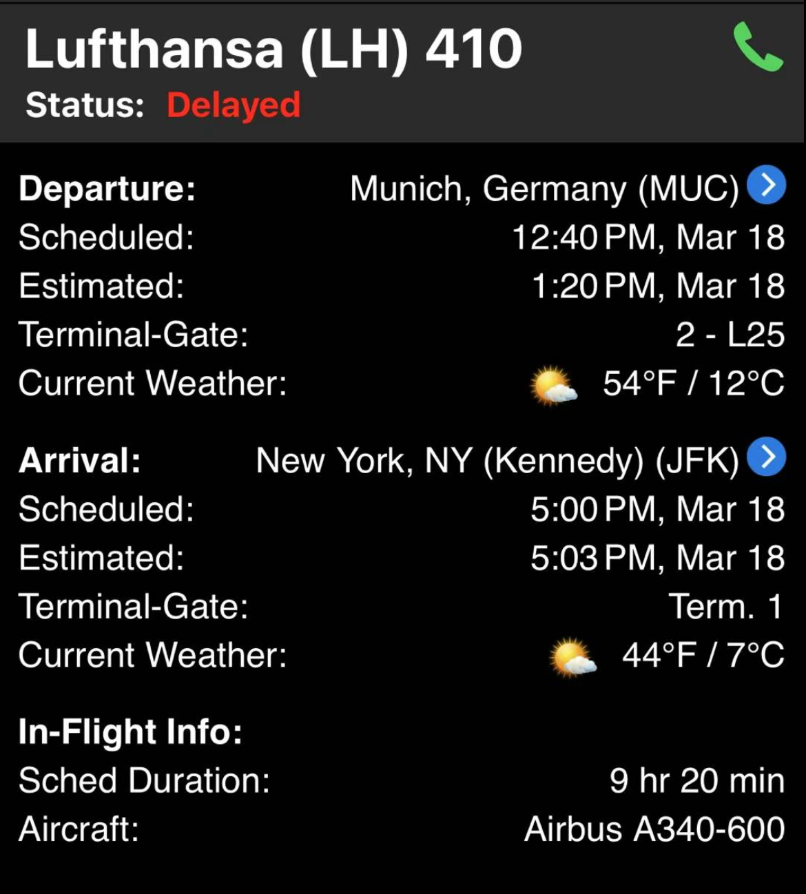 A friend is traveling from Munich to New York on Lufthansa (LH410) today, and encounters delay. The reason?